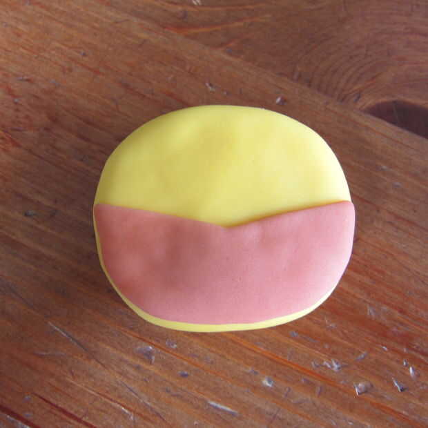 1. forma huevo de fondant amarillo en las palmas y aplanar a cerca de 1/2 pulgada.