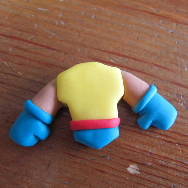 3. Corte el pedazo pélvico en fondant azul y palillo a la pieza de cuerpo amarillo.