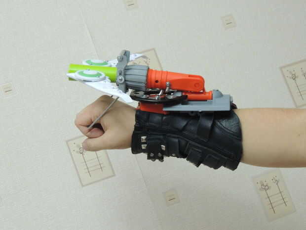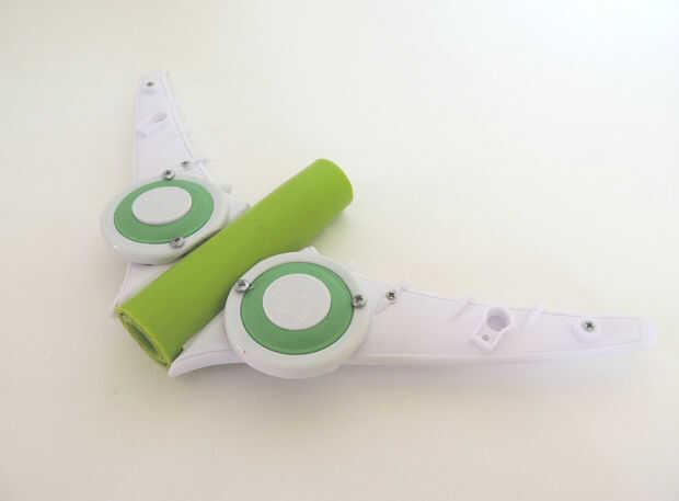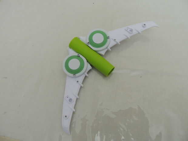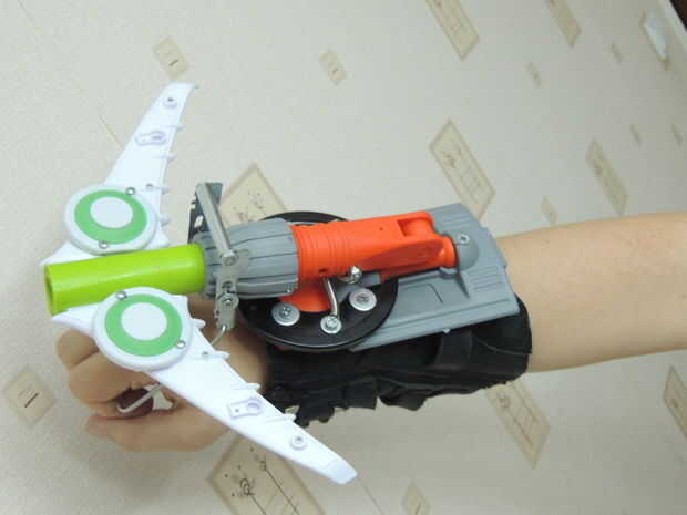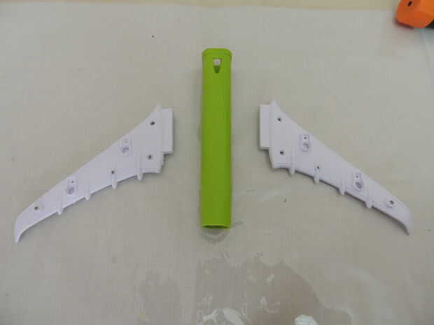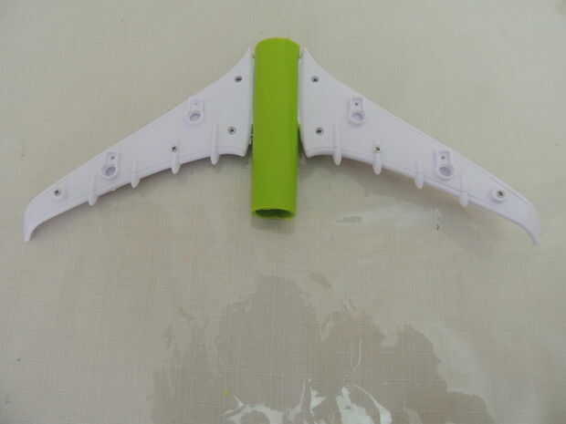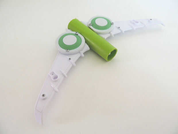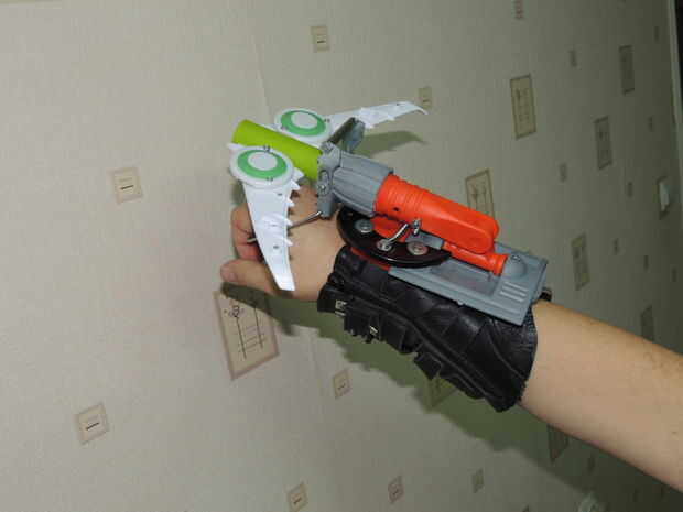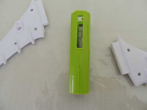 Usé las alas de un avión de juguete roto, la palanca de lo limpiaparabrisas y un recipiente pequeño-secador de pelo. Si bien creo que se ve impresionante en las fotos, tengo que seguir experimentando, porque su rendimiento está aún lejos de ser óptima. Probablemente es porque el proyectil necesita alas adicionales para la estabilidad. O tengo que jugar con el peso del misil. O las alas tienen el tipo de rendimiento aerodinámico que puede esperar de un juguete de niños de 5 años.