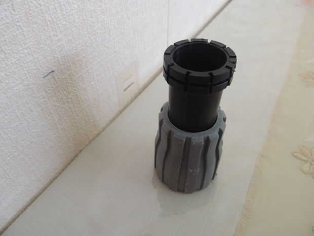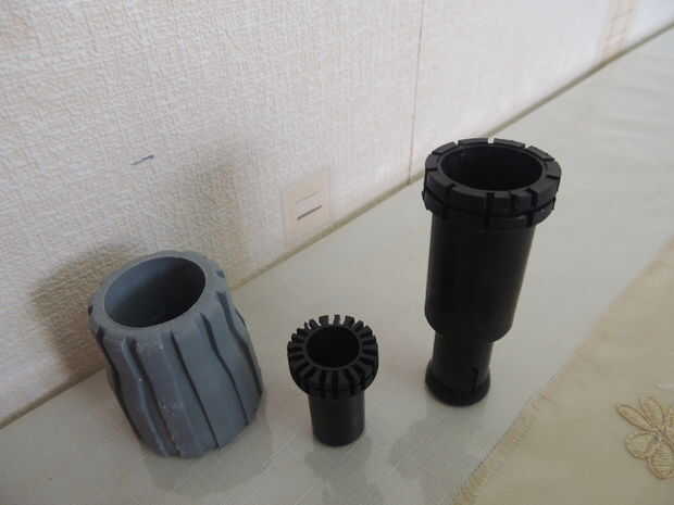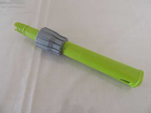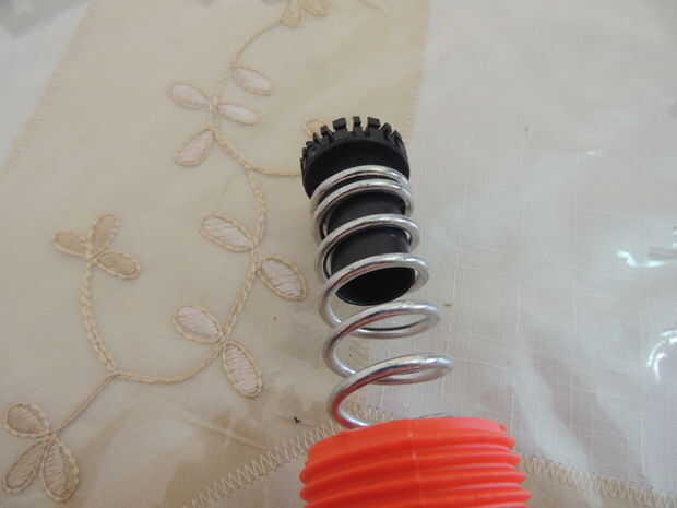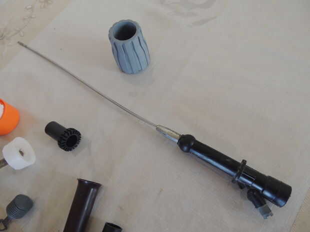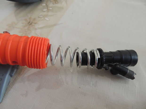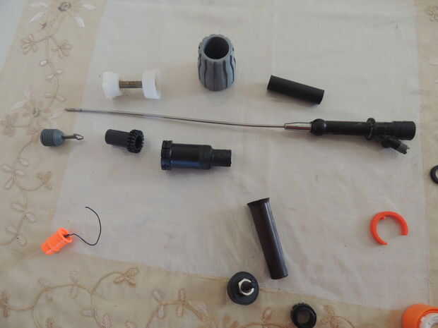 Quitar la boquilla (la pieza gris de la pipa de la fregona) e iniciar el montaje de cilindros de plástico hasta encontrar los que cumplen perfectamente para la fabricación de proyectiles. No demasiado apretado, no demasiado suelta. Y para los cilindros que coincidan con (flojo) con la primavera.