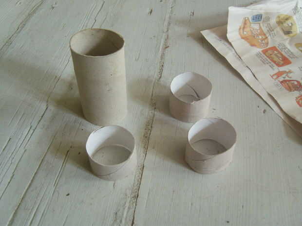 Instrucciones para anillos de servilleta de papel de tocador DIY1. en primer lugar, cortar el rollo de papel higiénico en varios tubos más pequeños. Minas fueron aproximadamente 1 1/2 pulgadas de ancho, pero puede hacerlos como todo o flaco como quie
