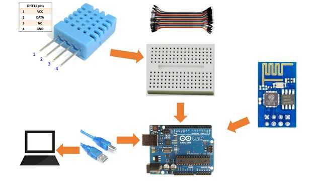 Entre Arduino UNO y DHT11 usan tablero de pan pequeña como ayudante y le cables de protoboard pequeño se para hacer las conexiones como: