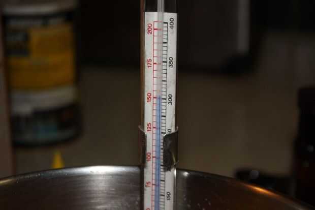 Retirar del fuego a precisamente a 300 grados F (tenga en cuenta que la temperatura seguirá aumentando algunos después de tirar el jarabe del fuego) o si no utiliza un termómetro, gotas del jarabe forman duro, frágiles hilos de rosca en agua fría (crack dura etapa). Después de que ha dejado toda la acción de ebullición agregar el saborizante y revuelva.