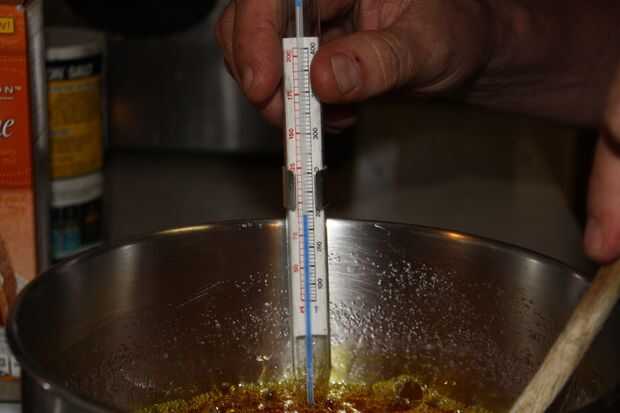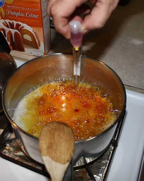 Una vez que se haya disuelto todo el azúcar Coloque su termómetro de caramelo en la sartén, asegurándose de que no toque el fondo de la olla.