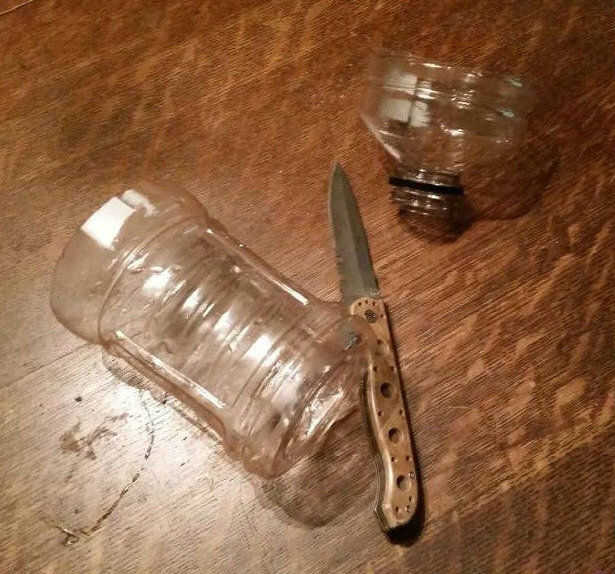 A continuación, cortar la parte superior de la botella. Usando su cuchillo, hacer una incisión horizontal que recorre todo el camino alrededor de la botella. El corte debe ser aproximadamente 1/3 de la manera abajo de la botella. Lo más importante, hacer el corte en una "zanja", entre dos "golpes" en el plástico. Los golpes arriba y abajo el corte deben ser aproximadamente del mismo tamaño. También, quitar la tapa de la botella, si la hay.