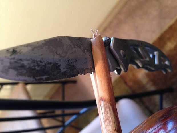 este instructable le mostrará cómo hacer un arco y flecha. Fuera de algunas casa cosa.Paso 1: Lo que se necesita Se necesita un palo recto que trata de grosor 2inches. una cadena y un cuchilloPaso 2: cortar las muescas usted necesita cuchillo para co
