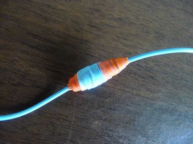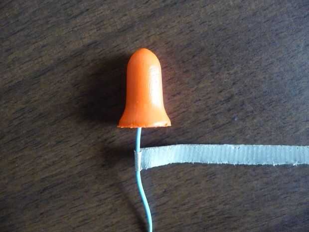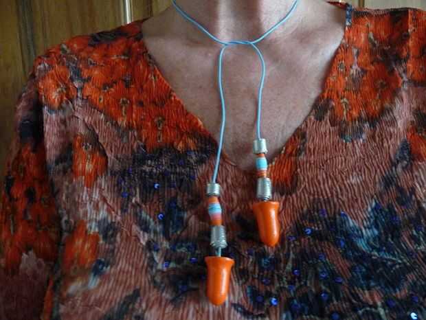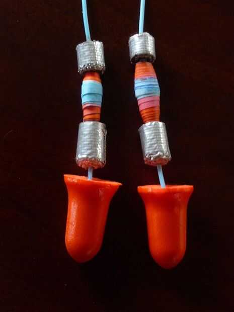 Convertido a esta simple par de tapones para los oídos en un collar simple con algunas perlas de laminado en papel color-coordinada y finas tiras de cinta metálica en granos de la espuma.