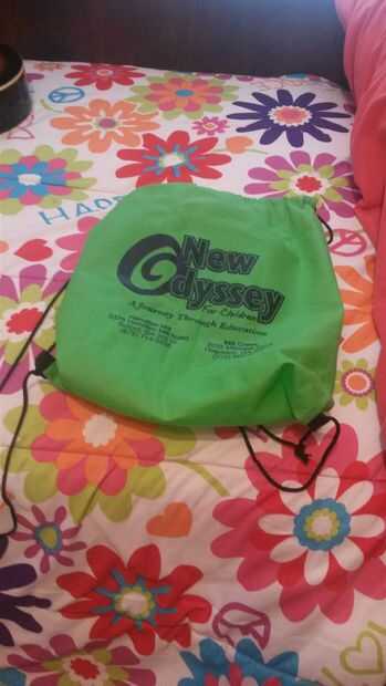 usé una bolsa que tenía correas de cuerda. Recomiendo usar un bolso porque no es tan abultado. Y se siente bien. :-) el logo era de una escuela de pre-kinder. Pero repartían bolsas gratis. Tengo uno ya que no quieren un bolso gratis.