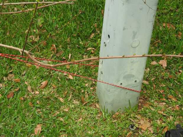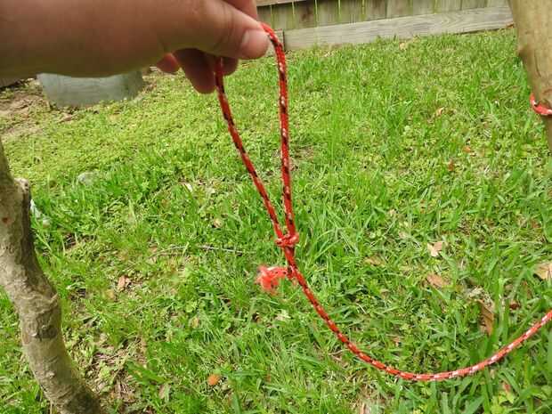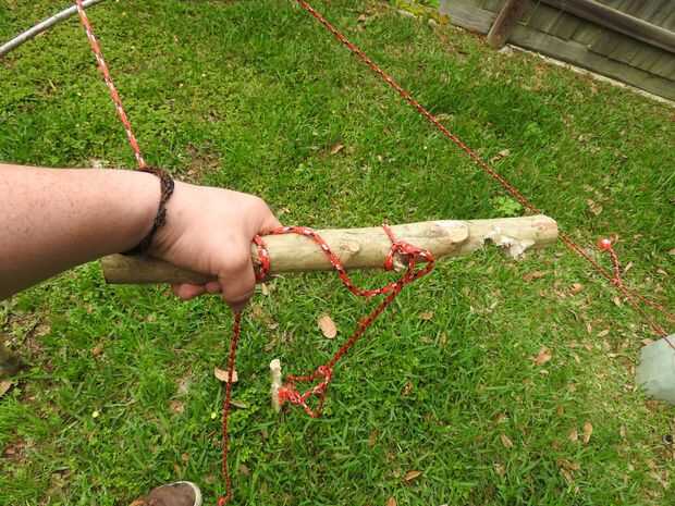 Una vez que todo se corta y martillado, consigue un trozo largo de cuerda y cortar en dos pedazos, atar un extremo de una pieza a la mitad superior de la palanca que va en la parte superior, luego atar la otra pieza en el otro extremo de ese mismo palo, ahora tienes un palo con dos trozos de cuerda atada a él , ahora las piezas de bloqueo y toma la cuerda en la parte superior de la palanca y envolver alrededor de una rama flexible y asegúrese de que los pedazos enclavijados no soltarse, ahora atar el extremo de esa cuerda a algo robusto para mantener la rama doblada y la cuerda tensa, ahora toma el pedazo de cuerda atada a la parte inferior de la palanca y hacer un nudo del resbalón , ahora la trampa de supervivencia debe hacerse
