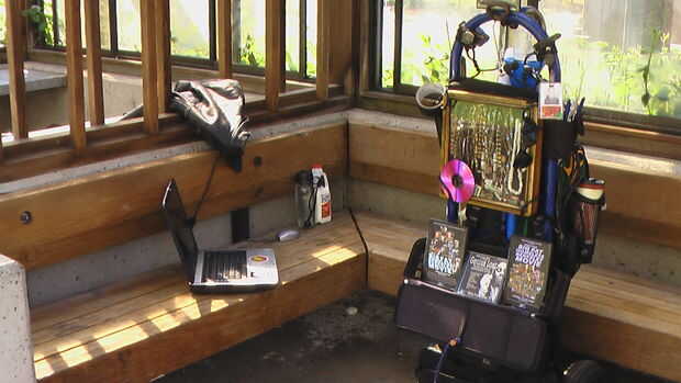 como un cineasta "vivienda deteriorada" y vendedor ambulante de mis DVDs, necesitaba una manera de guardar mi electrónica conmigo en todo momento y también necesitaba una pantalla extremadamente portátil que yo podría desaparecer con tan pronto