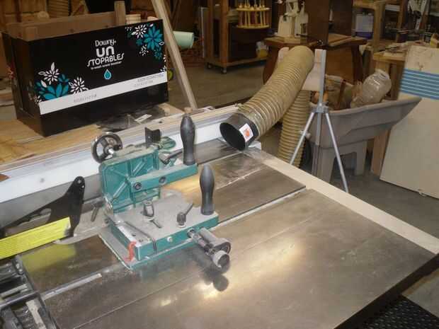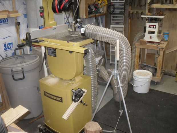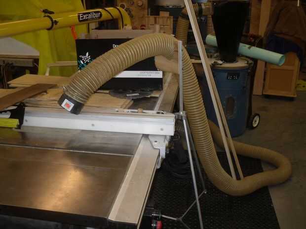 Mi sierra de mesa tiene capacidad de colección de polvo a través de un puerto de la parte inferior de cuatro pulgadas y un coleccionista de brazo. Utilizar el puerto de fondo religioso, pero el colector brazo consigue utilizado con tablas más anchas, o cuando se utilizan plantillas, porque interfiere con el uso de un bloque de empuje.