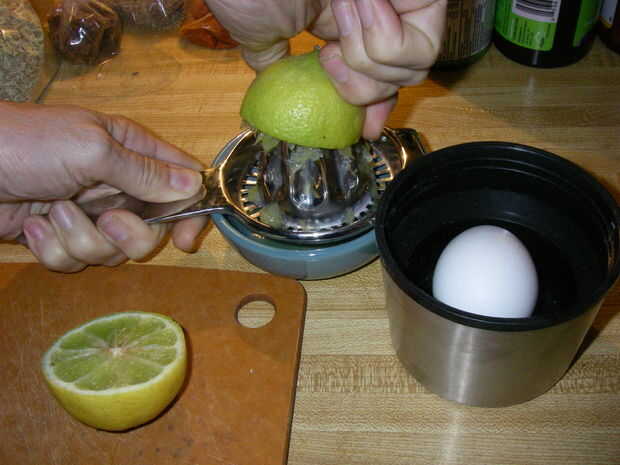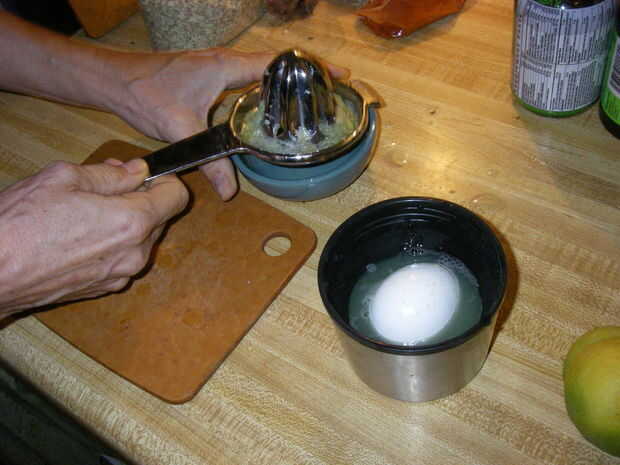 Poner el huevo en la taza. Si la Copa ajusta el huevo bien, necesitarás menos jugo.