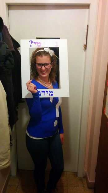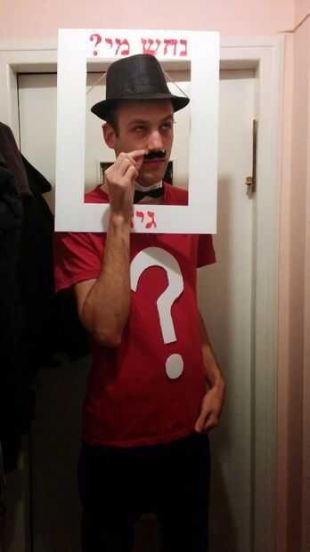 Poner en un par de pantalones llanos y una camisa azul/rojo (Asegúrese de que coincide con la escritura en el marco). utilizar alguna cinta para pegar el signo de interrogación en camisa (algunos de la cinta alrededor de sí mismo con el lado adhesivo hacia fuera para conseguir a una especie de cinta de doble cara de abrigo).