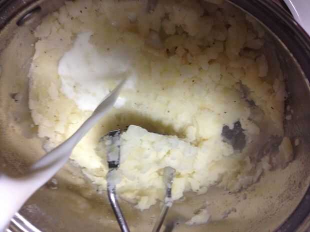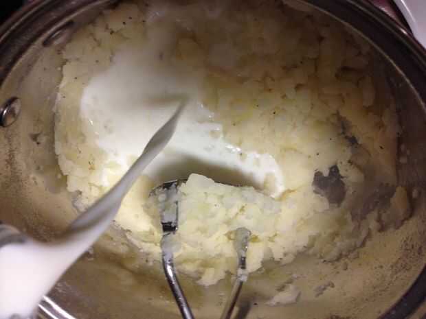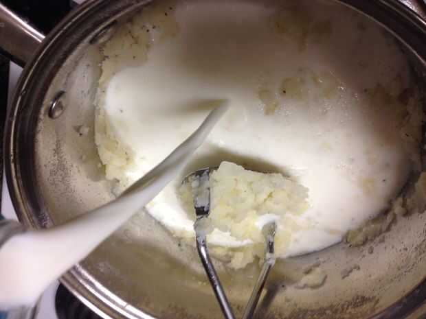 9. hasta llegar a una consistencia de sopa, agregar la leche a las patatas. Esto variará a preferencias personales, como algunos como una sopa más gruesa que otros. Un buen comienzo es agregar media taza de leche a la vez.