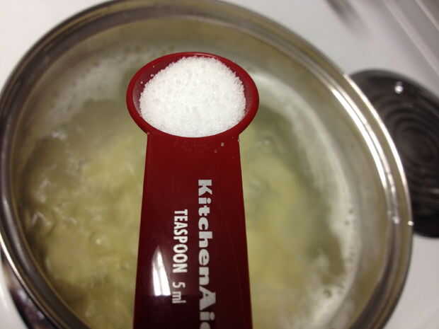 3. Agregue las papas en rodajas y 1 cucharadita de sal en la cacerola de 3 cuartos que pones el agua en. Recomiendo realizar este paso antes de colocar la olla sobre el quemador para evitar posibles quemaduras.