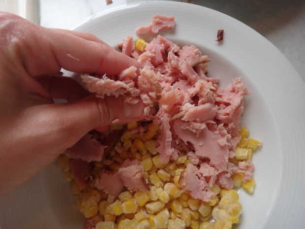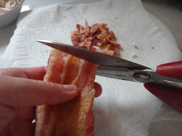 Se reúnen las tiras de bacon y cortarlo con unas tijeras. Es más fácil y más rápido de esa manera.