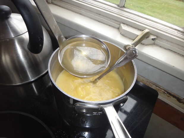 En otra olla, poner la crema de pollo y agregar una taza de caldo hecho con las pechugas de pollo.