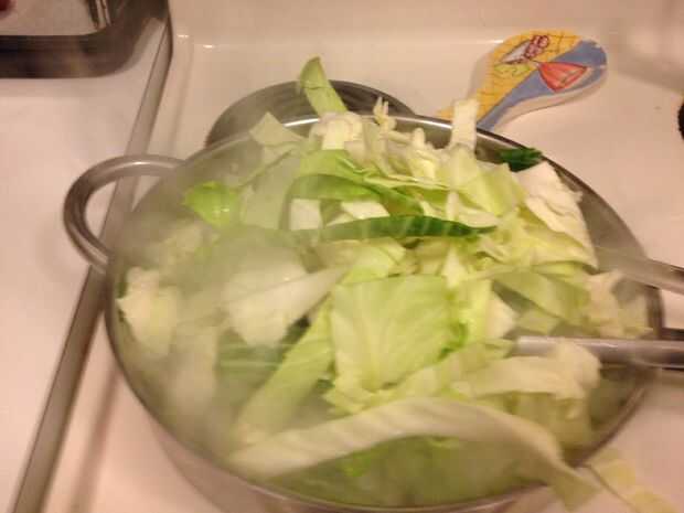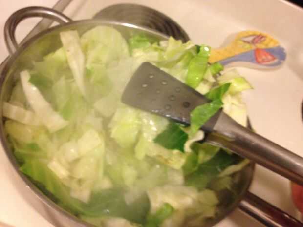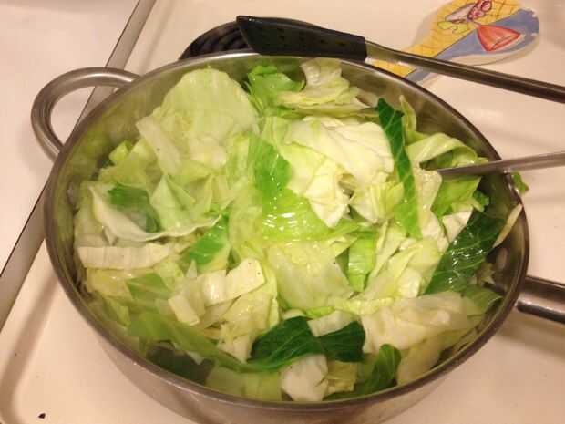 Añadir tanto repollo como quepan, (cerca de 1/2). Como se pone a cocinar por flip / remover con pinzas hacer la col cocida la parte superior y la col cruda en la parte inferior.