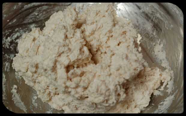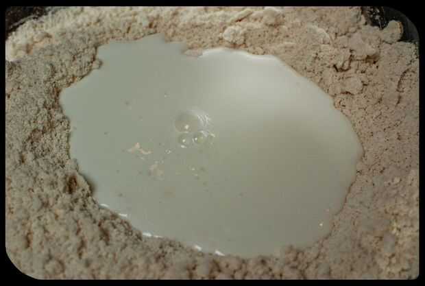 Después de diez minutos, formar un hueco en el centro de la harina y vierta el suero de leche. Usando una cuchara o una espátula, incorporar lentamente la harina en la leche hasta que se forma una masa pegajosa agradable.