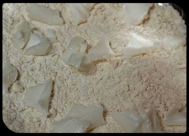 Utilizando la segunda parte de 1/4 taza de manteca de cerdo, cortado en trozos del tamaño de una canica y añadir a la mezcla de harina. Usando el mismo movimiento de chasquido de dedos, mezclar estos trozos grandes de grasa en la harina hasta que no permanecen trozos y la harina se ve agradable y desmenuzable. Si esto tomó más de 5 minutos, colocar la harina en la nevera por 10 minutos enfriar la grasa.