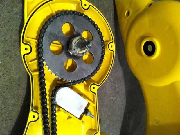 1. IMPORTANTE = la cadena debe ir de la parte superior de la rueda de engranaje de la hélice en la parte delantera de la rueda de engranaje de pedales. Esto asegurará que cuando se pedalea hacia adelante, la hélice va empujarte hacia adelante, no hacia atrás.