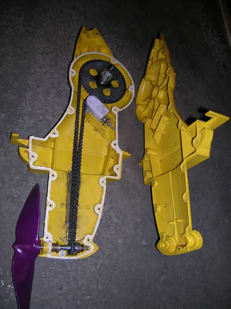 • Coloque un rollo de cinta adhesiva debajo de la carcasa para que el eje del pedal puede ir a través de él y mantener el cuerpo en posición horizontal, con el lado izquierdo de la carcasa en la parte inferior (importante porque el propulsor es cautivo de la mitad izquierda).