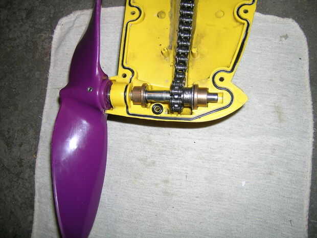 1. El eje de la hélice es sostenido en lugar por un perno va a través de la rueda de engranaje de la cadena en el eje.