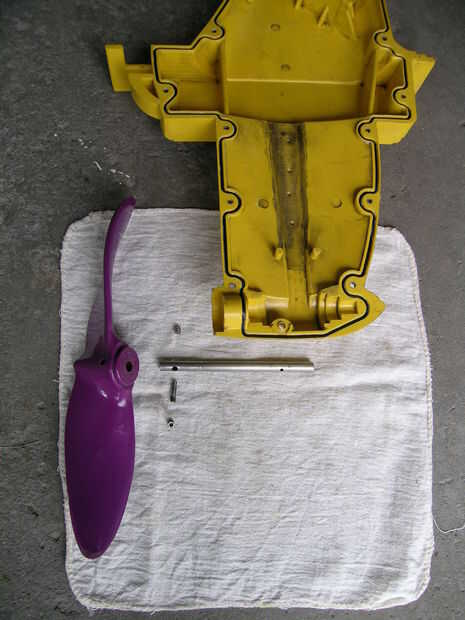 1. Si necesita reemplazar la hélice o el eje, cuenta de una vez quitar los 2 tornillos de la hélice, usted tendrá acceso al perno que sujeta la hélice en la posición en el eje.