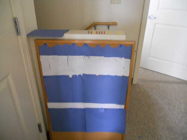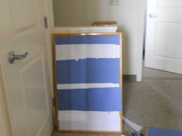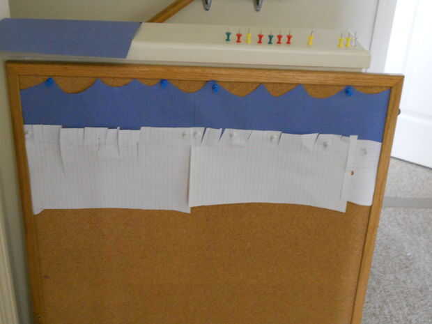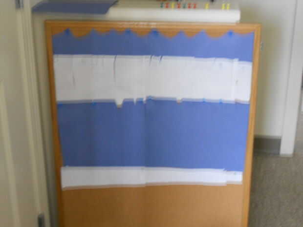 Ahora es el momento para las ondas... Tiene que su tablero del corcho. Comenzar con 2 pedazos de papel azul. Cortar un diseño de onda en el lado del papel como se muestra en la foto. A continuación tomar su libro blanco y que se vea como una marea por corte o ripeo de lado al azar. ahora hacer con el azul. luego se añade una franja delgada blanca antes del azul siguiente. Ahora usted finalmente envuélvalo para arriba con el blanco en la parte inferior.