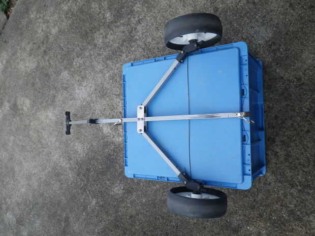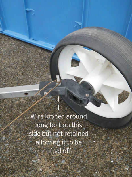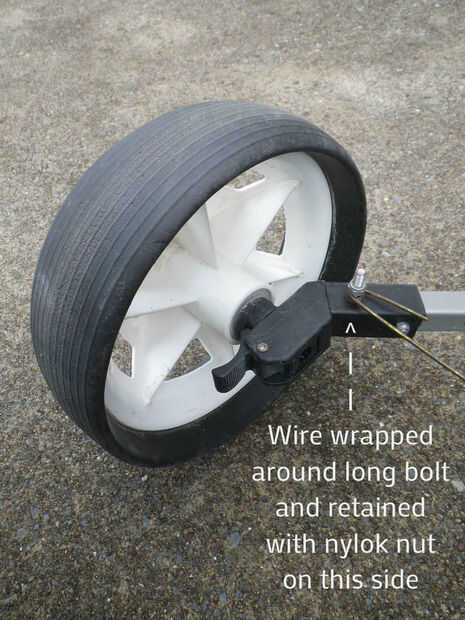 Conecté el frente del cajón y espalda con el PTO pins e instala un perno largo hacia arriba cerca de las ruedas para participar en la base de la caja en los bordes. Esto mantiene todo alineada y las ruedas de correr recto. Para ayudar a alinear todo durante el montaje, una longitud de alambre envuelto alrededor de los dos largos pernos ayuda mantener el espaciado al insertar los pasadores del PTO.