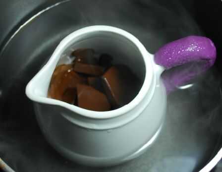 Derrita el chocolate en el horno o en el microondas y remover hasta que quede suave. Usé una pequeña jarra para que el chocolate podría ser vertido directamente de él. Se ha añadido una funda de silicona para el lado en lugar de guantes.