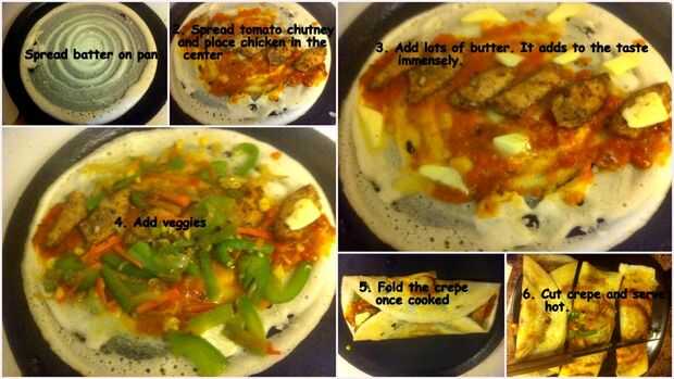 • Siga todos los pasos que hicimos para hacer la crepe de verduras marinados mantequilla. Añadir pollo a la parrilla junto con otros ingredientes del crepe/dosa.