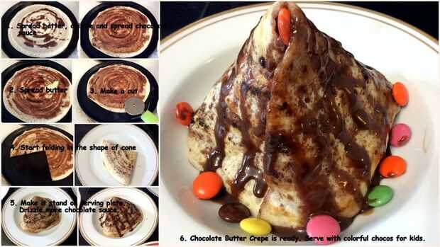 1. Casi igual que vegetales marinados mantequilla Dosa. La única diferencia es, difundir en lugar de las verduras, salsa de chocolate y la mantequilla en la capa superior del dosa del crepe.