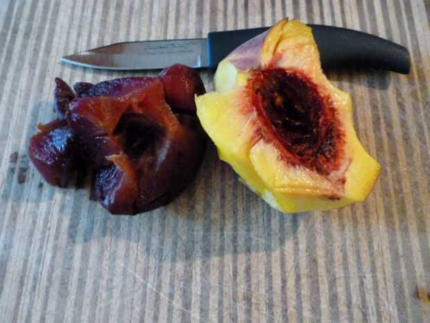 Cortar el limón por la mitad, luego cortar la ciruela y el durazno por la mitad y quitar los hoyos.  Exprima el jugo de limón sobre las mitades.  Ahora hacer cortes irregulares alrededor de los bordes de las mitades de la fruta para formar las tomas.