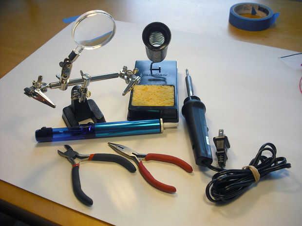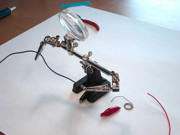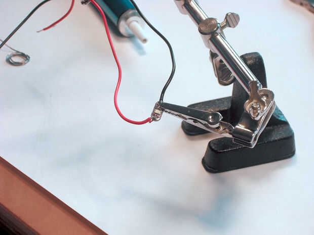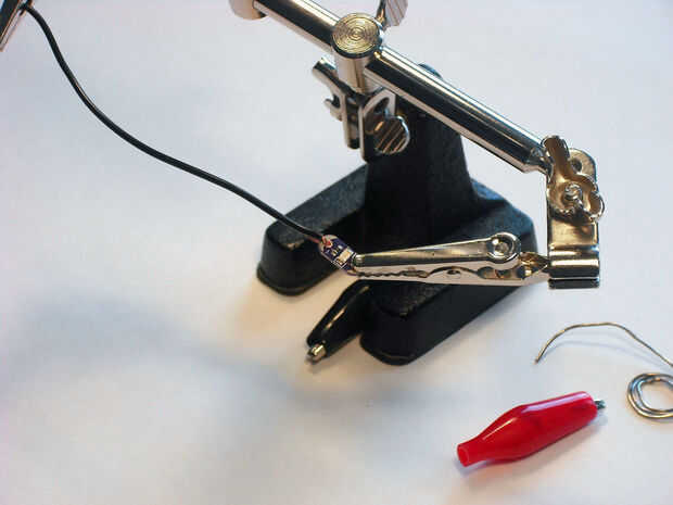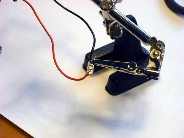 Suelde el cable negro al terminal negativo (marcado "-") en el LED. Utilice la tercera herramienta de mano para mantener el LED de la derecha (o izquierda dependiendo de su mano dominante). Utilice el clip enfrente para sostener el cable recto y constante para que no se mueva cuando se suelde