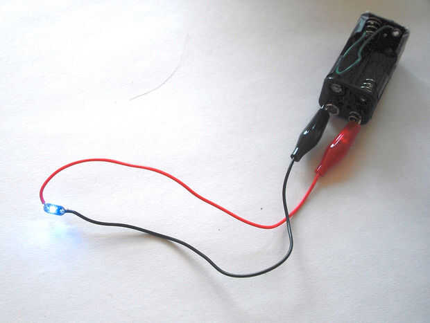 Conectar LED a una fuente de alimentación de 3V. El soporte de la batería probablemente se verá diferente. Llevar las baterías y coloque en el portapilas. Prueba LED conectando las pinzas al soporte de la batería. Conecte la pinza roja al borne positivo de la batería y coloque pinza cocodrilo negra en el extremo terminal negativo de la batería.