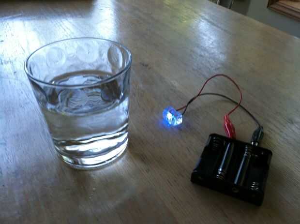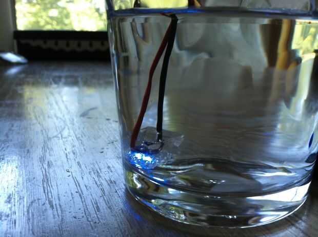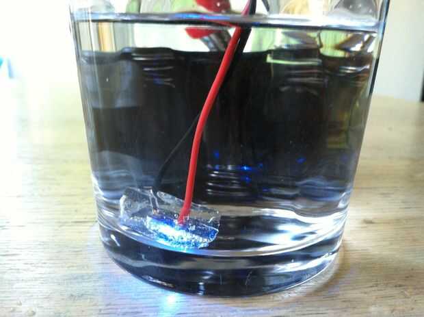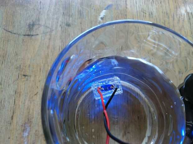 Tomar encapsulado dispositivo y conecte las pinzas a la batería titular/fuente de alimentación para asegurarse de que el LED se enciende. Otra vez asegurándose de que las polaridades terminal cocodrilo apropiado cable están contactadas a la batería. Luego tome un vaso llenado de agua y lugar el dispositivo en el recipiente de agua. Ahora usted tiene un dispositivo electrónico de prueba de agua! Variaciones es posible encapsular y otros dispositivos electrónicos a prueba de agua.  Compruebe hacia fuera la simple prueba que funcionó en el paso siguiente.