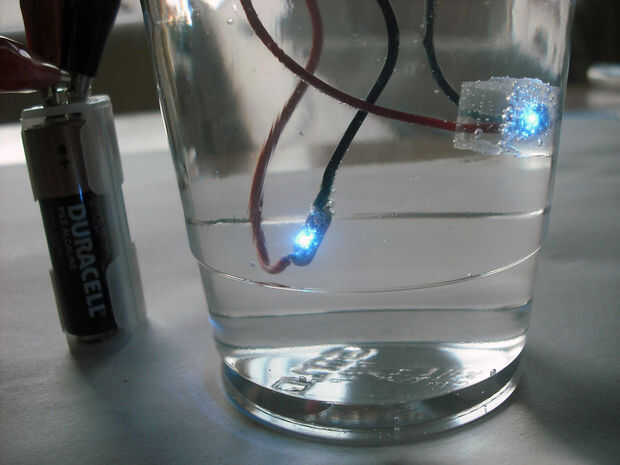 Cuando se coloca en el agua, tanto el lilypad encapsulada y unencapsulated LED de sobrevivir en el agua. Después de la exposición en agua a 13 horas, ambos LED de todavía continúan trabajando sin embargo, un notable nivel de corrosión en los electrodos del dispositivo LED unencapsulated es visto, mientras que el dispositivo impermeabilizado no muestra ningún daño.