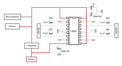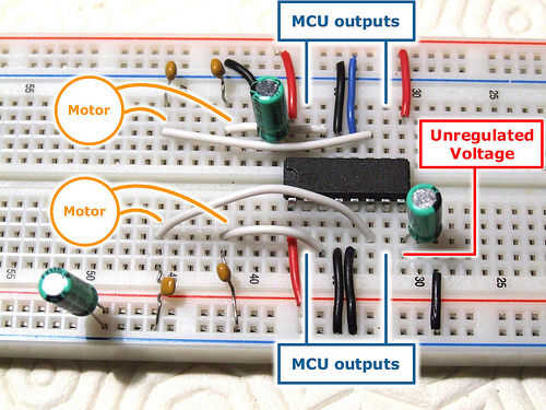 Esta es la aplicación correcta (con los condensadores) y tenga en cuenta que el pin 8 es alimentado por tensión no regulada. Esto significa que si sus motores tienen más de 5V, debe poder este pin con la cantidad de voltaje y el resto del circuito con 5V.
