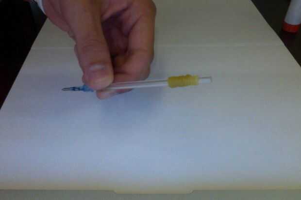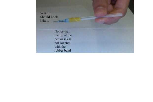 Paso 2: Deslice la banda de goma abajo del tubo hasta llegar justo antes de la punta. Usted puede encontrar este proceso frustrante, pero hacerlo lentamente y con cuidado para que su agarre va a quedar bien. No quiere hacer esto con cuidado y luego después de su hecho darse cuenta de que tiene que rehacer porque no se ve bien. Tenga en cuenta que la banda más estrictos que han envuelto la goma alrededor del tubo de la tinta, más difícil será para abajo. (ASEGÚRESE DE QUE NO CUBRIR LA PUNTA DE LA TINTA)