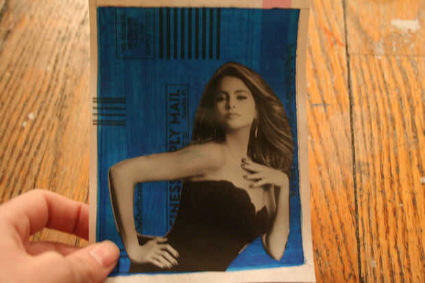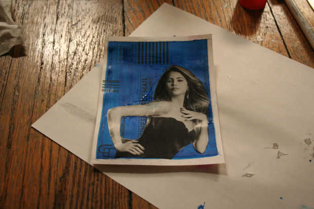 Cortar una imagen de una revista vieja y usar adhesivo en aerosol para fijar a la parte delantera de su tarjeta de pintado. Dejar secar totalmente.