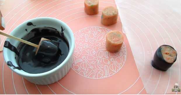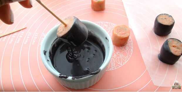 Meter un palillo de dientes en una sola pieza de la torta de sushi y sumergido en el derretimiento de azúcar negro. Asegúrese de cubrir el fondo entero, lados y el borde superior de cada pedazo de torta. Permite exceso llovizna apagado y colocar sobre papel encerado para secar.