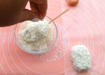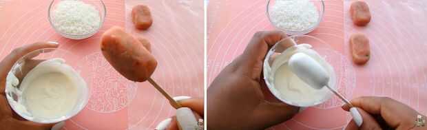 Coloque un palillo de dientes en un pedazo de la torta de sushi rectangular y sumergió en blanco candy melt. Permitir un poco de exceso a llovizna apagado y luego en los copos de coco devestadores. Colocar sobre papel encerado y retire el palillo de dientes. Permita que se endurezca.