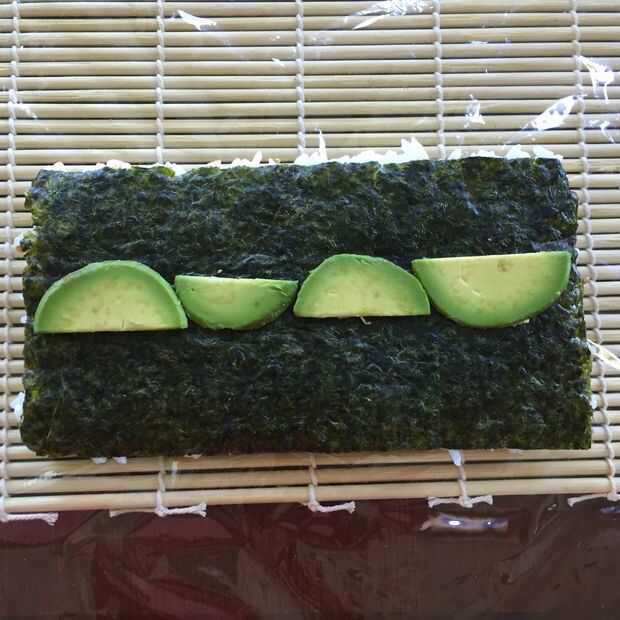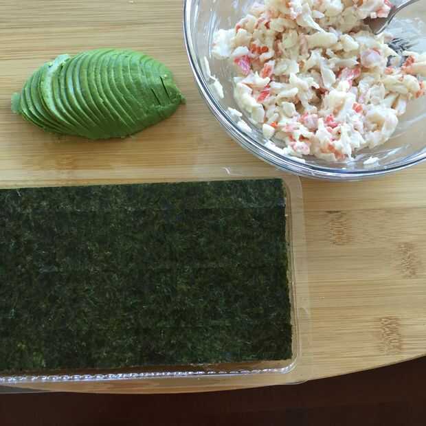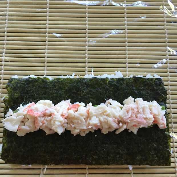 Vuelta el nori para que el arroz se enfrenta hacia abajo. Agregar una fila de rodajas de aguacate y, a continuación, la mezcla de carne de cangrejo en la parte superior.
