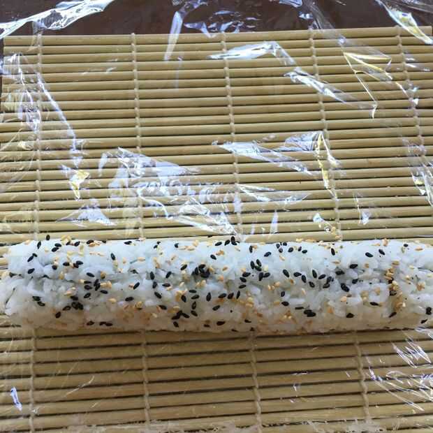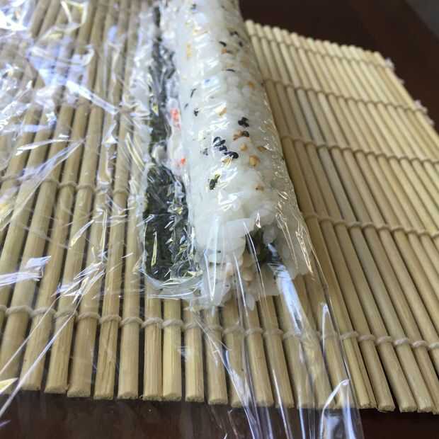 El sushi con la estera de bambú del rodillo. Apriete el borde interno a medida que avanza. Asegúrese de que la envoltura plástica esté fuera del camino y pellizcar los bordes juntos apretando la malla.