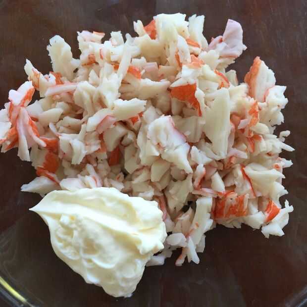 Primero se tritura el cangrejo y agregue la mayo hasta combinado uniformemente.
