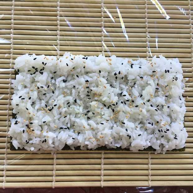 Coloque una hoja de nori en la parte superior con el lado rugoso hacia arriba. Cubrimos en arroz unos 3/8" de espesor. Espolvorear semillas de sésamo.