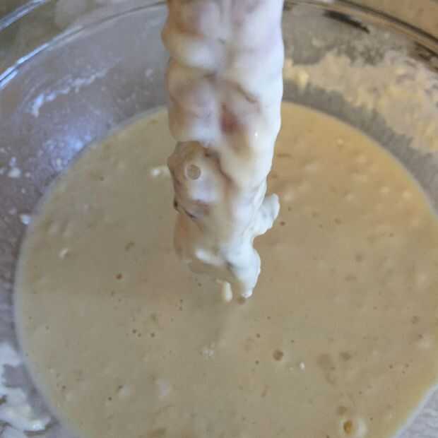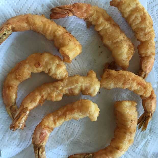 Hacer cortes en la parte posterior de su camarón por lo que en posición plana. Sumergir en la mezcla de tempura y freír hasta que estén doradas.