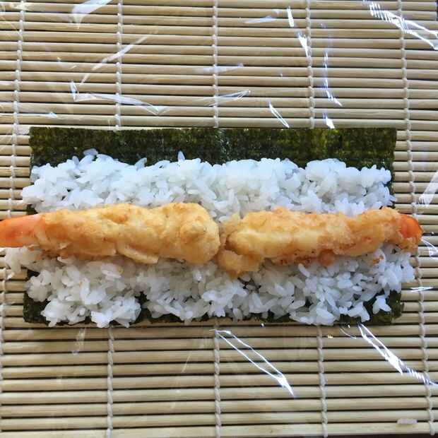 Para hacer el rollo empezar cubriendo su nori arroz. Esta vez Asegúrese de que dejar el borde del nori descubierto como cuadros. Coloque el camarón en la parte superior del arroz. Enrolle y selle el borde con un poco de agua.