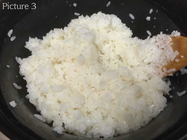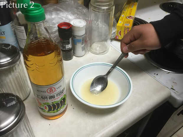 Mientras el arroz se cocina, podemos comenzar el siguiente proceso de hacer arroz de sushi, que es condimento del arroz. Este es el proceso más importante en este paso, que el sabor del arroz como el arroz de sushi. Para ello, necesitamos utilizar el azúcar, la sal y el vinagre. Para dos tazas de arroz, debemos utilizar 3 cucharadas de azúcar, 2 cucharaditas de sal y 4 cucharadas de vinagre de arroz. Mezclar la anterior condimento juntos en una olla pequeña y calentar hasta que se disuelvan todos los sólidos (ver figura 2).